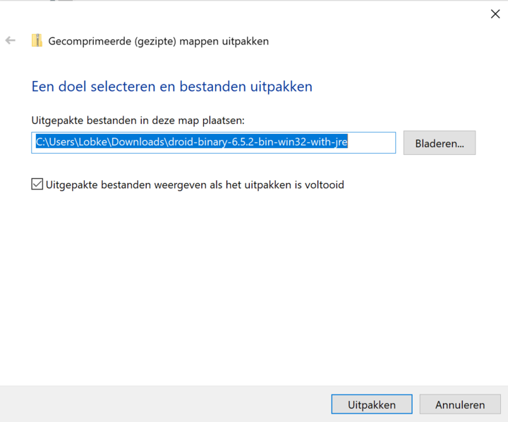 | Beschrijving | Nederlands: Kies de DROID-map als locatie voor de te uit te pakken bestanden