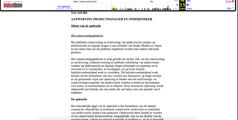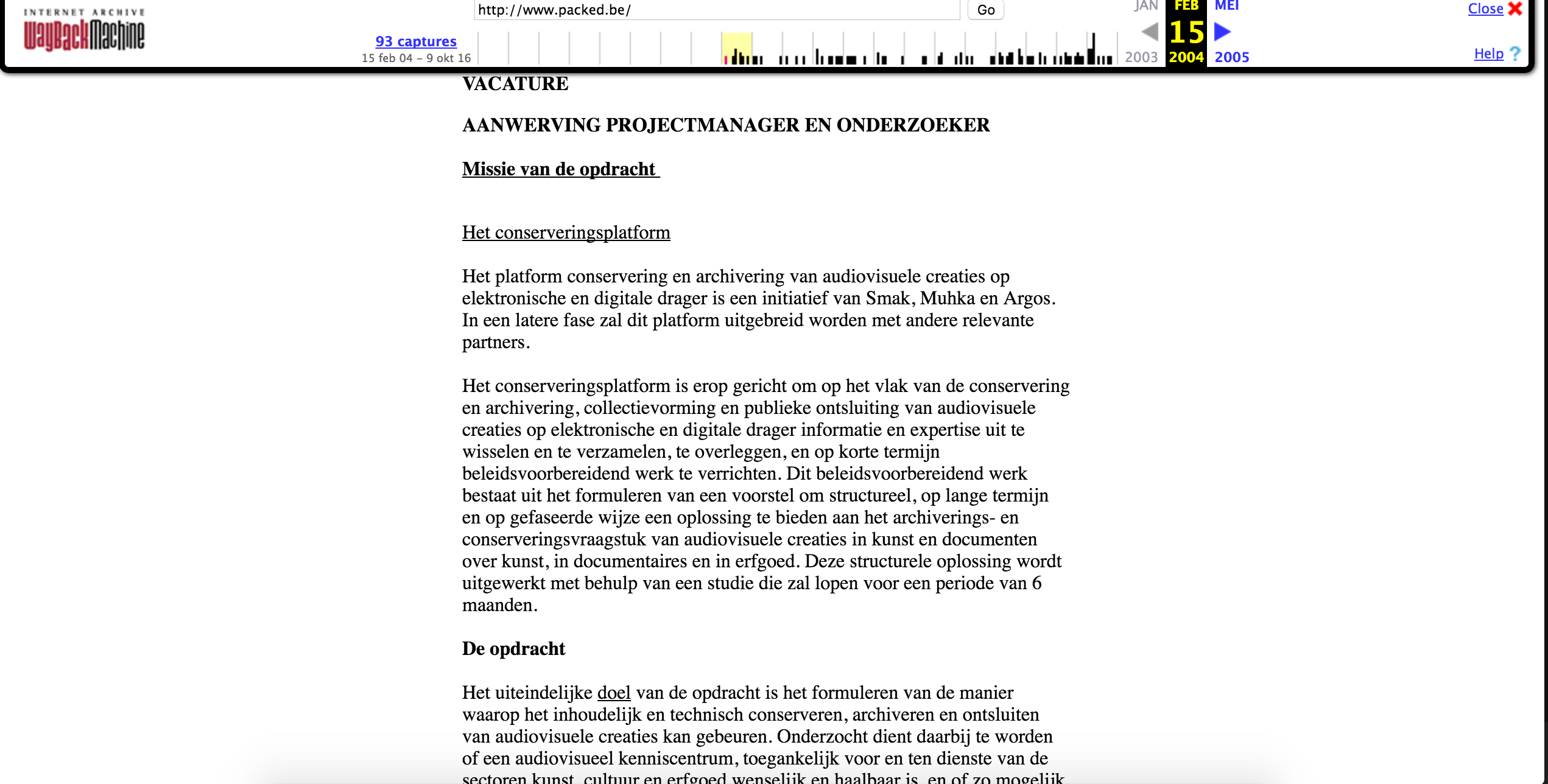 | Beschrijving | English: Door op een datum te klikken kom je op een oude versie van de gearchiveerde website. Dit is de website van PACKED vzw op 15 februari 2004.