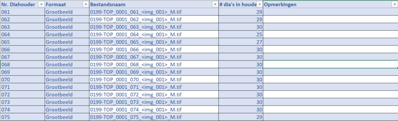 Example spreadsheet for digitising slides. Each slide is given a unique number (left column) and an indication of the number of slides per holder (fourth column), so you can check that all slides have been scanned and returned. The register also gives the supplier clear instructions about what filenames need to be given to the reproductions (third column).