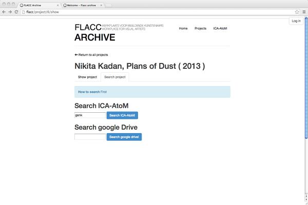 Door PACKED vzw werd bij FLACC een overkoepeld systeem geïnstalleerd. In het programma wordt een fiche voor ieder project aangemaakt met rechtstreekse verwijzingen naar de beschrijving in ICA-AtoM, de bestanden op de server en de documenten op Google Drive.