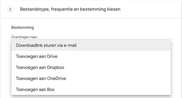 - Onder "Bestemming" kan je kiezen waar het archief met e-mails moet terechtkomen. Standaard staat geselecteerd dat je via e-mail een downloadlink wil ontvangen, maar je kan er ook voor kiezen om het op te slaan in Google Drive, Dropbox, OneDrive en Box.