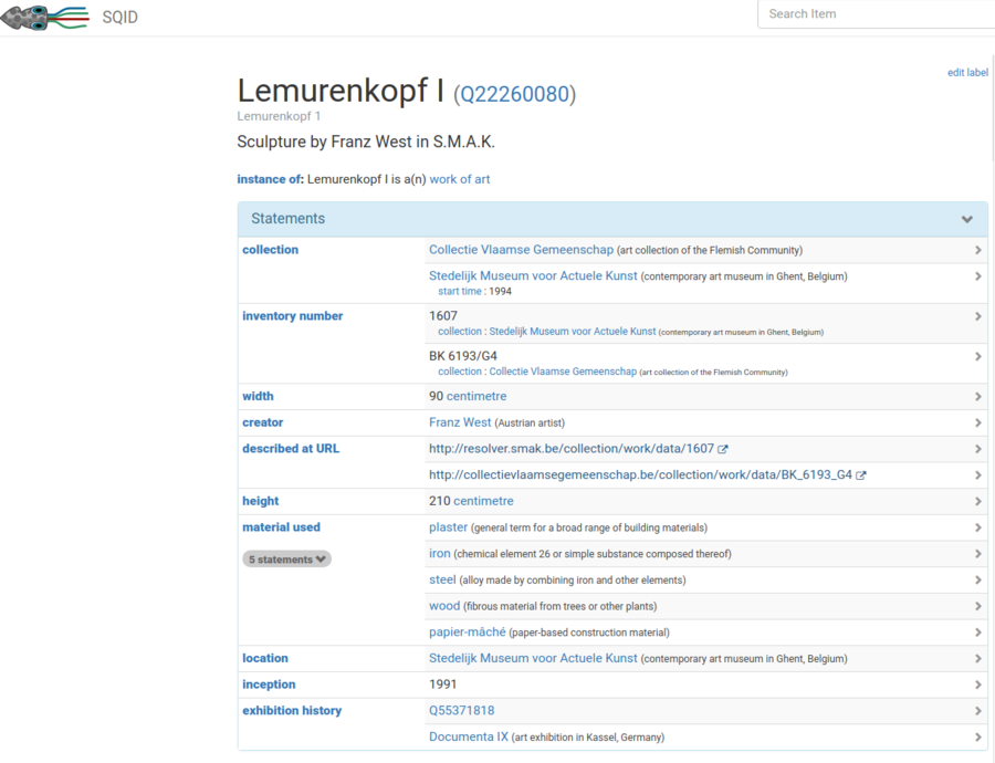Tenslotte werd een extra verrijking gerealiseerd door tentoonstellingen aan data over kunstwerken te koppelen. Door data uit verschillende bronnen aan elkaar te koppelen, leggen we de basis voor een tentoonstellingshistoriek van kunstwerken op Wikidata. Zelfs internationaal is dat onontgonnen terrein op Wikidata. We namen als voorbeeld de tentoonstelling Museum for a Small City, een tentoonstelling die tussen 2013 en 2014 in S.M.A.K. liep en gecureerd werd door Richard Venlet. De informatie over welke werken op welke tentoonstellingen stonden werd aangeleverd uit de Adlibdatabank van S.M.A.K. PACKED vzw werkte in een eerder traject al samen met S.M.A.K. rond de publicatie van open data over kunstwerken in de collectie. Doordat een aantal van de kunstwerken deel uitmaakte van deze tentoonstelling, konden we de data zinvol verrijken en hergebruiken door ze aan één of meerdere tentoonstellingen te koppelen. Als resultaat kan je enerzijds nagaan welke werken deel uitmaakten van een tentoonstelling, en anderzijds op welke tentoonstellingen een bepaald werk stond. Ook opent dit soort ontsluiting en koppeling van data mogelijkheden voor onderzoek over een hele collectie: wanneer een hele collectie geregistreerd is en aangevuld is met tentoonstellingsdata, kan dat een inzicht geven in het bereik van een collectie, verschillende tendenzen in tentoongestelde werken, welke werken veel reizen, waarheen ze reizen,...