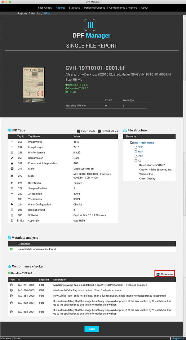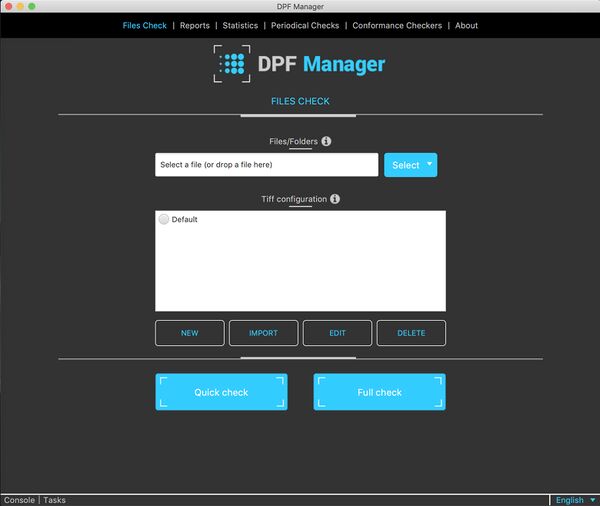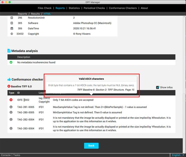 DPF Manager is een open source tool voor de controle van TIFF-bestanden die bijzonder gebruiksvriendelijk is. Via een eenvoudige interface toont DPF Manager of je TIFF-bestand voldoet aan de juiste TIFF-specificatie. Voldoet je bestand niet, dan geeft de tool ook aan waarom niet.