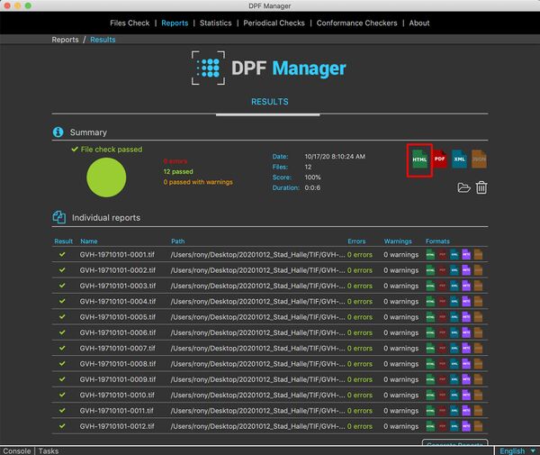 Alle rapporten, zowel voor de hele folder als voor de individuele TIFF-bestanden, kan je opvragen in vier bestandsformaten: in HTML, PDF, XML en JSON. Dat doe je door op de iconen ‘HTML’, ‘PDF’, ‘XML’ en/of ‘JSON’ te klikken. Voor het validatierapport van een individueel TIFF-bestand klik je op de iconen ‘HTML’, ‘PDF’, ‘XML’ en/of ‘JSON’ achter het bestand.