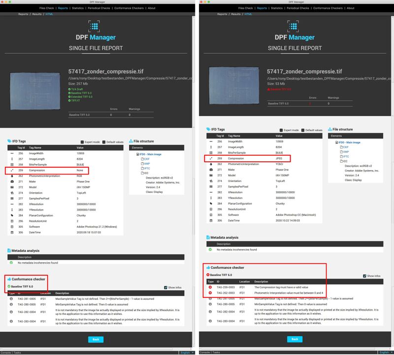 Hieronder zie je de validatierapporten van eenzelfde beeld: links opgeslagen zonder compressie, rechts opgeslagen met JPEG-compressie. Het TIFF-bestand waarin JPEG-compressie is gebruikt, geeft een foutmelding.