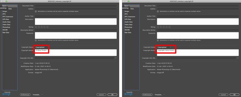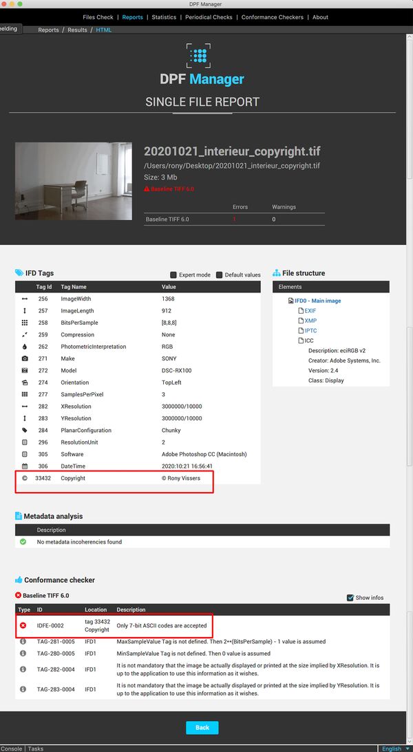 Deze fout kan je makkelijk corrigeren. Als je het bestand opent met een beeldbewerkingsprogramma (bv. Adobe Photoshop of GIMP) en vervolgens de ingebedde metadata bekijkt, kan je makkelijk © Rony Vissers wijzigen in copyright: Rony Vissers. In Adobe Photoshop krijg je toegang tot de ingebedde metadata door in het menu onder 'File' op 'File info' te klikken. In GIMP krijg je toegang tot de ingebedde metadata door in het menu onder 'Afbeelding' eerst op 'Metadata' en vervolgens op 'Metadata bewerken' te klikken. Vergeet na de aanpassing het gewijzigde TIFF-bestand niet op te slaan. Bekijk voor het aanpassen van ingebedde metadata ook de tool Ingebedde metadata bij foto's.