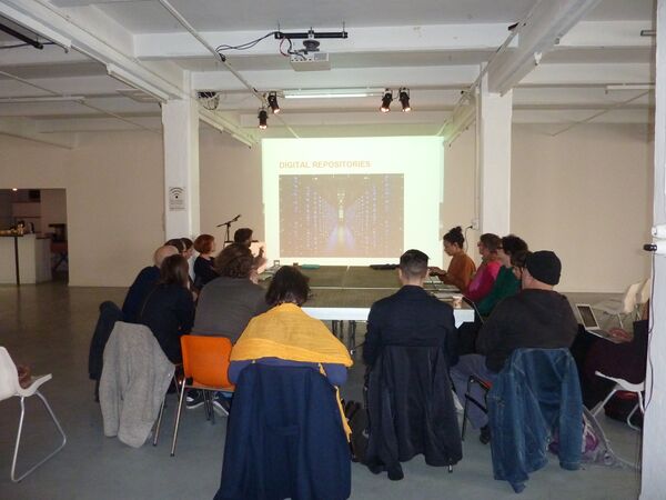 De laatste presentatie van de dag ging over het archief van iMAL zelf. Als een kunstenorganisatie bevat het archief zowel administratieve als artistieke documenten en objecten, zowel fysiek als digitaal. De actie in het archief ging van start met het in kaart brengen van alle fysieke en digitale onderdelen, gebruik makend van bestaande tools en software. Dit overzicht is de start voor verdure acties en aanbevelingen die het verlies aan informatie moeten beperken tot een minimum. Er was tevens een vrijwilligster betrokken bij de archiefacties bij iMAL. Wanneer er vrijwilligers komen helpen in het archief zijn er verschillende aandachtspunten waarmee rekening moet gehouden worden.