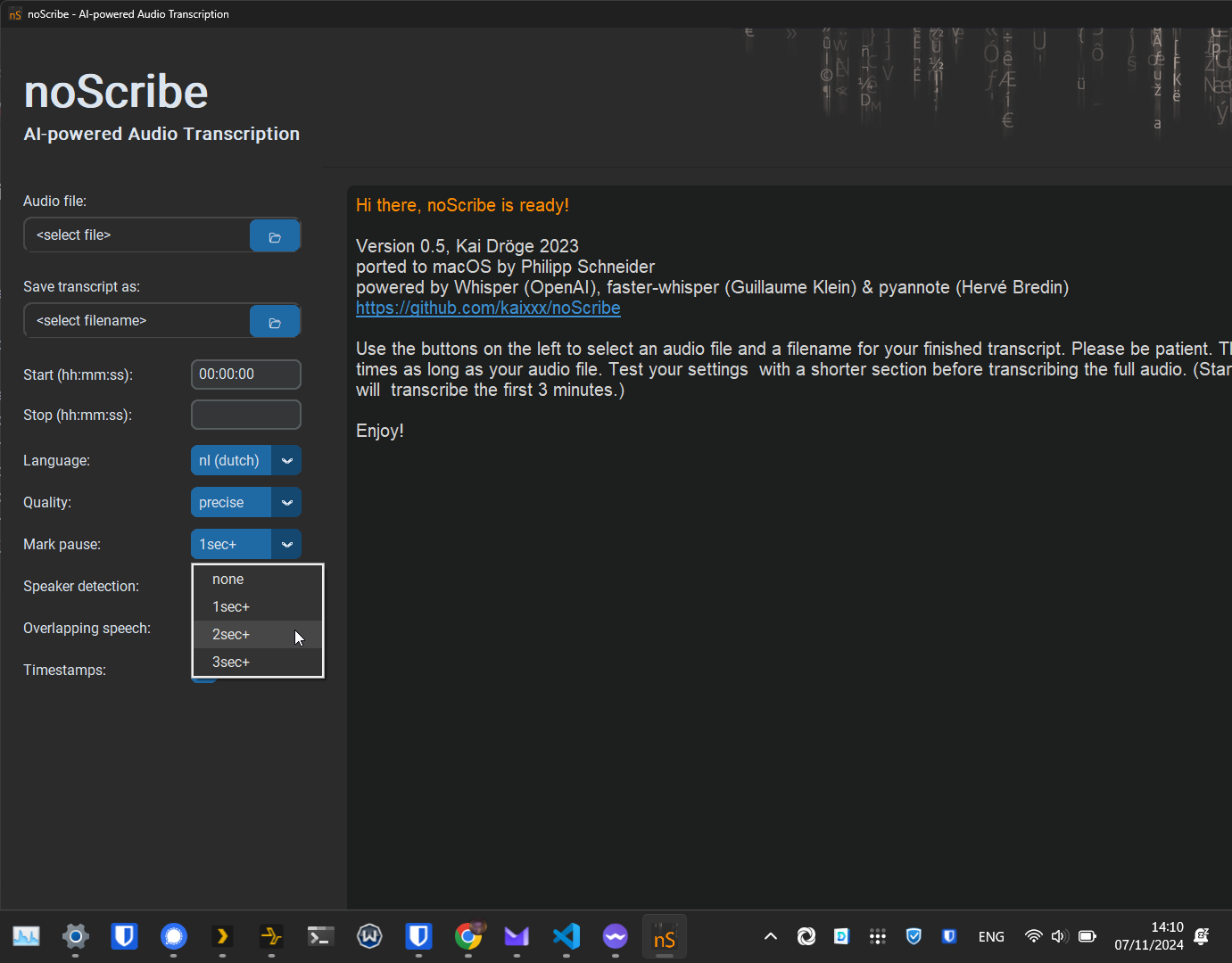 | 6 dec 2024 15:03 | Noscribe selecteer een te transcriberen audiobestand.png (bestand) | 117 kB | Selecteer een bestand om te transcriberen. | 1 | |